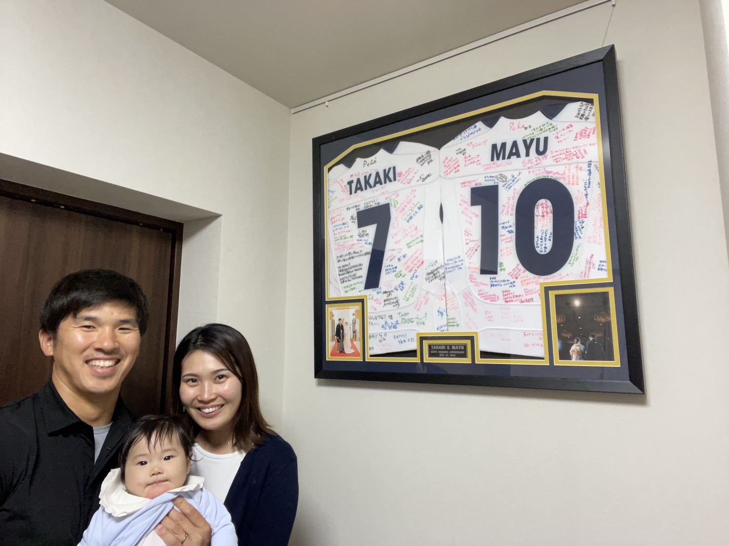 試合で着用していたユニフォームが美しく収められ、今はリビングに飾って毎日眺めています。